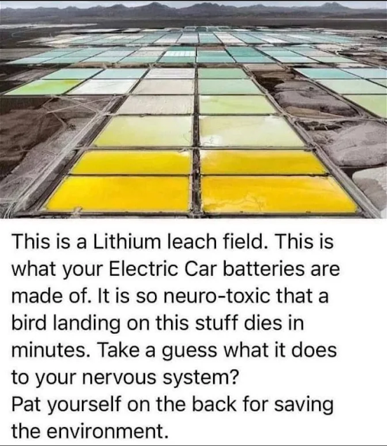 Yeah but the lithium leach field is on the other side of the world in some Turd World sh*thole country and perhaps staffed by child slave labor or illiterate indigenous types, so nobody cares. "Save the environment" no matter the ecological and economic cost, as long as it's NIMBY.